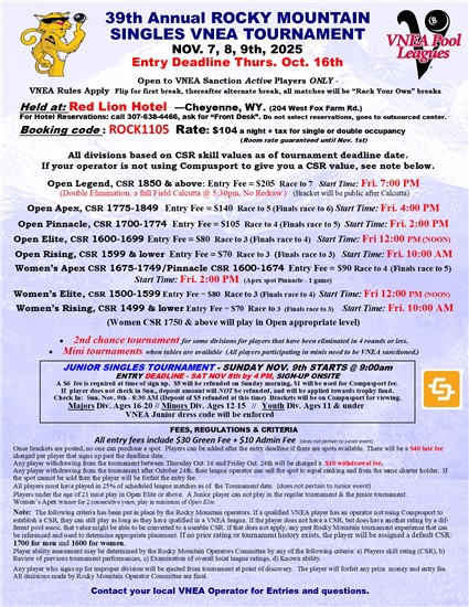 Rocky Mountain VNEA Singles Nov. 7-9, 2025 at Red Lion Cheyenne, WY.